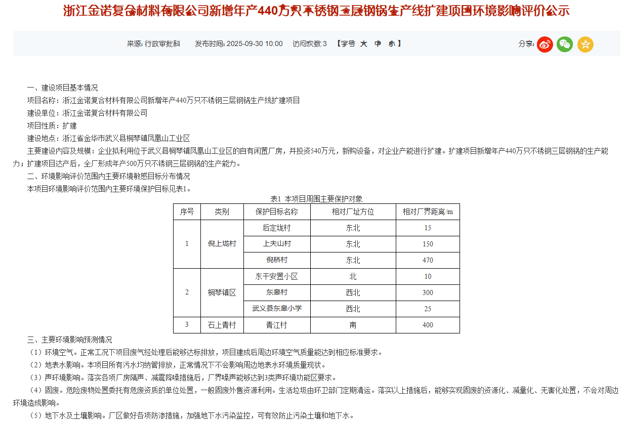 2025年9月30日,浙江金诺复合材料有限公司新增年产440万只不锈钢三层钢锅生产线扩建项目环境影响评价公示,公示期:10个工作日。