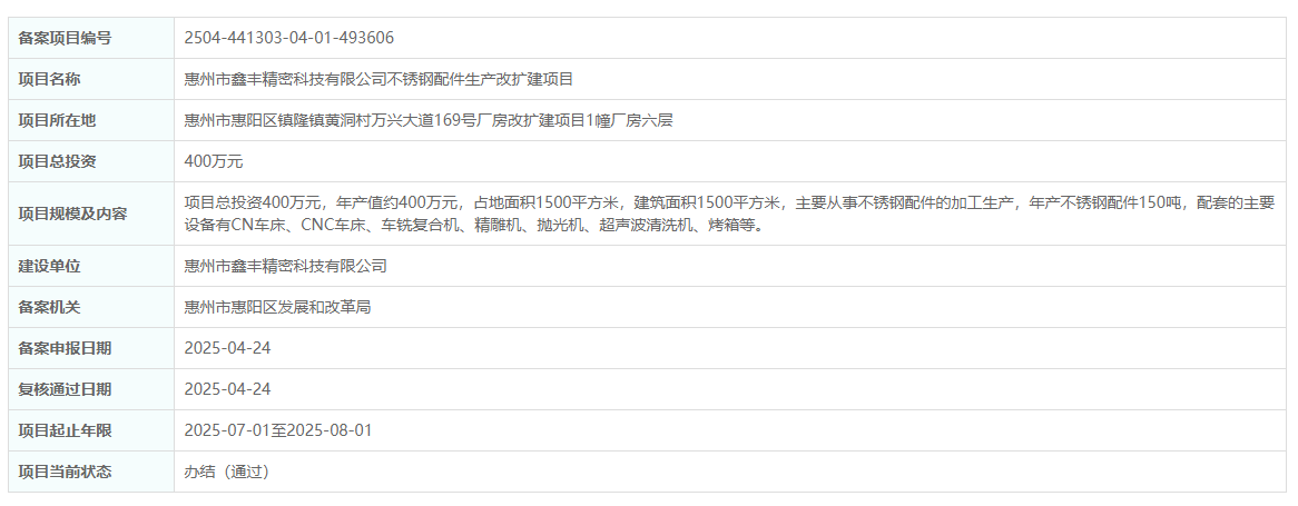 2025年4月24日,惠州市鑫丰精密科技有限公司不锈钢配件生产改扩建项目备案复核获通过。